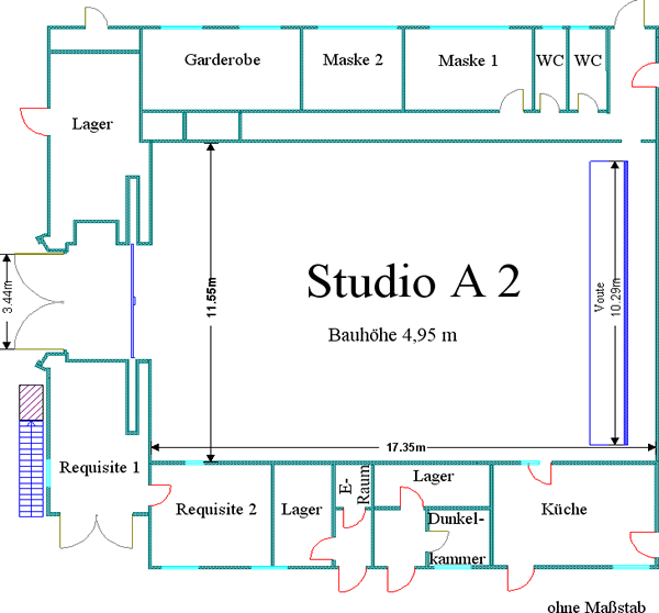 17,35 m x 11,55 - Bauhöhe: 4.95 m Voute : 10,00 m x 4,95 m Masken, Garderoben, Produktionsbüros, Küche