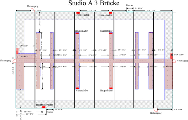 38,65 m x 23,65 m - Bauhöhe: 9.65 m Voute : 15,60 m x 7,60 m Masken, Garderoben, Produktionsbüros, Küche LKW - Einfahrten Bassin : 11,75 m x 7,95 m Rundhorizonte
